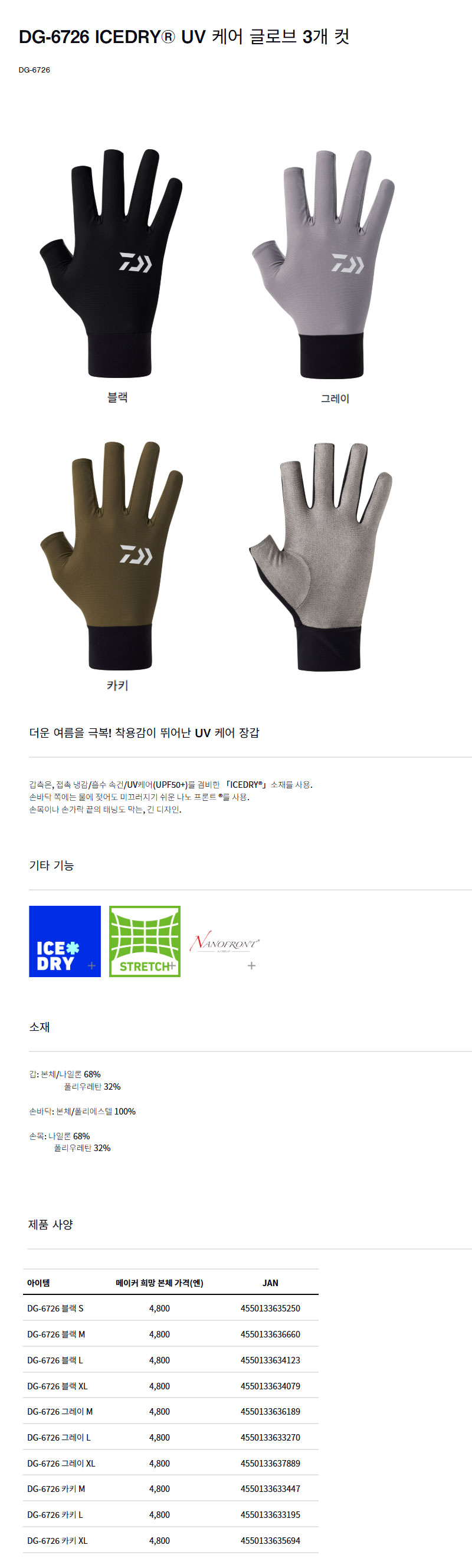 형제낚시 낚시용품의 모든것 다이와 DG-6726 아이스 UV 케어 케어글로브 다이와장갑