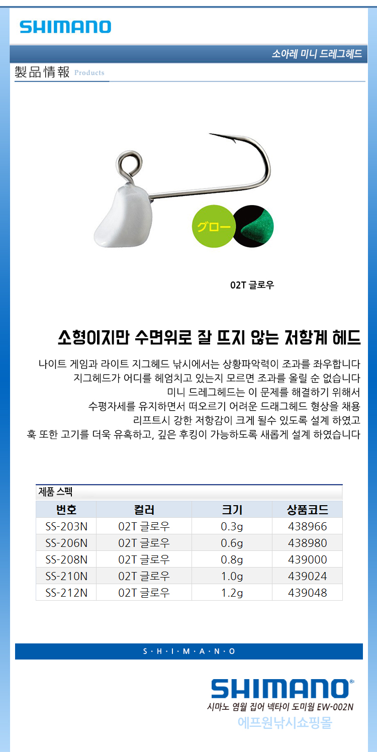특가시마노 소아레 볼락지그헤드 SS-203N 0.3g/야광지그헤드 아징루어웜