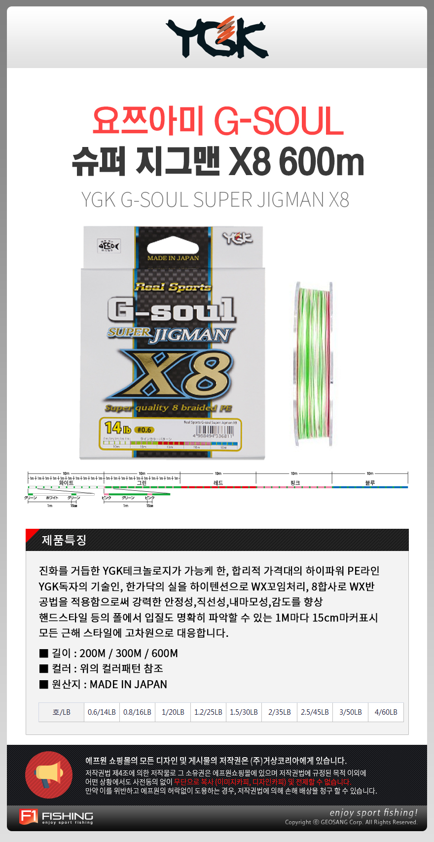 요쯔아미 슈퍼 지그맨 X8 600m/8합사 PE라인 루어5색