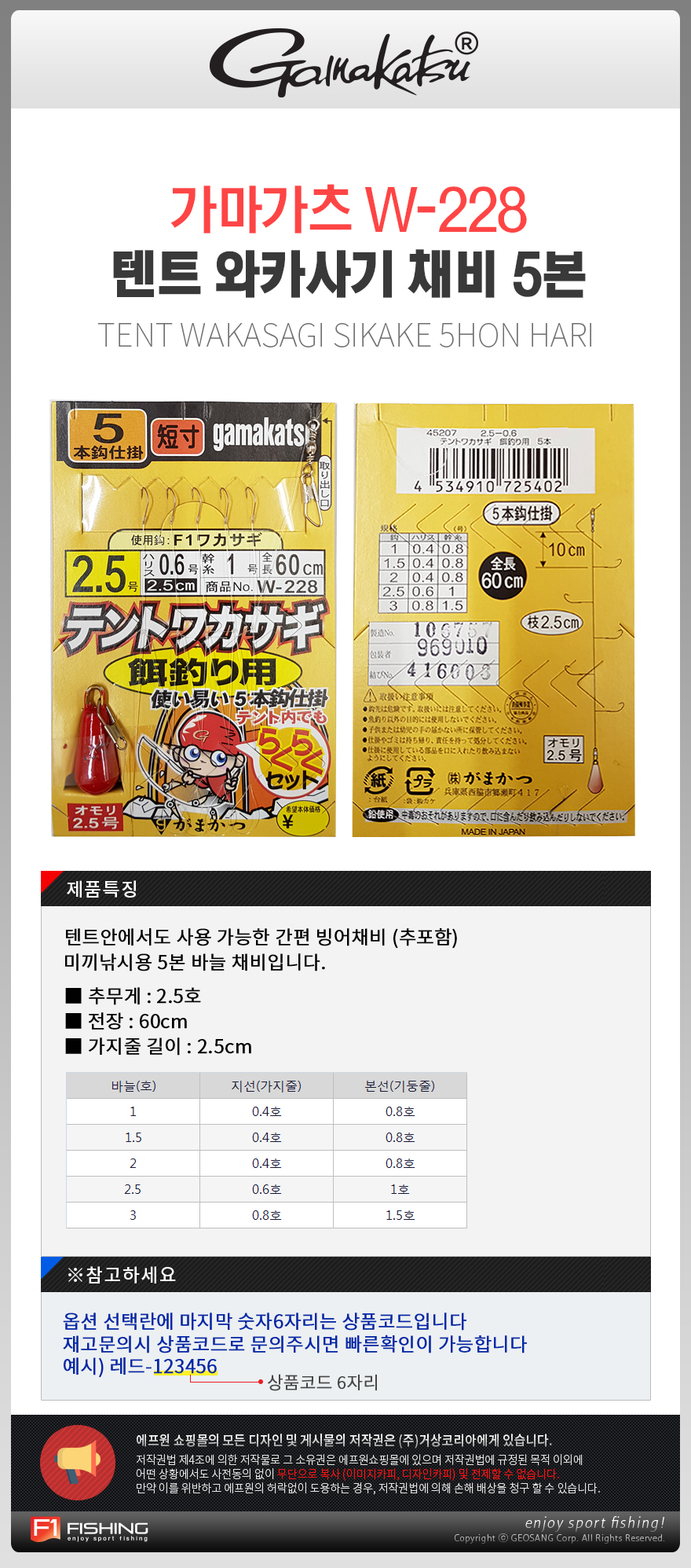 형제낚시 낚시용품의 모든것 특가가마가츠 W-228 텐트와카사기 채비 5본