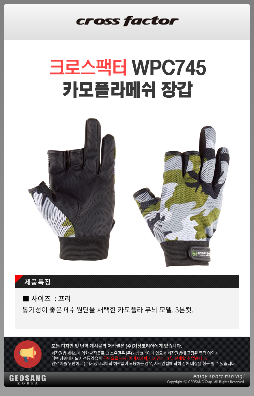 형제낚시 낚시용품의 모든것 크로스팩터 크로스팩터 WPC745 카모플라메쉬 장갑 3본컷/글러브