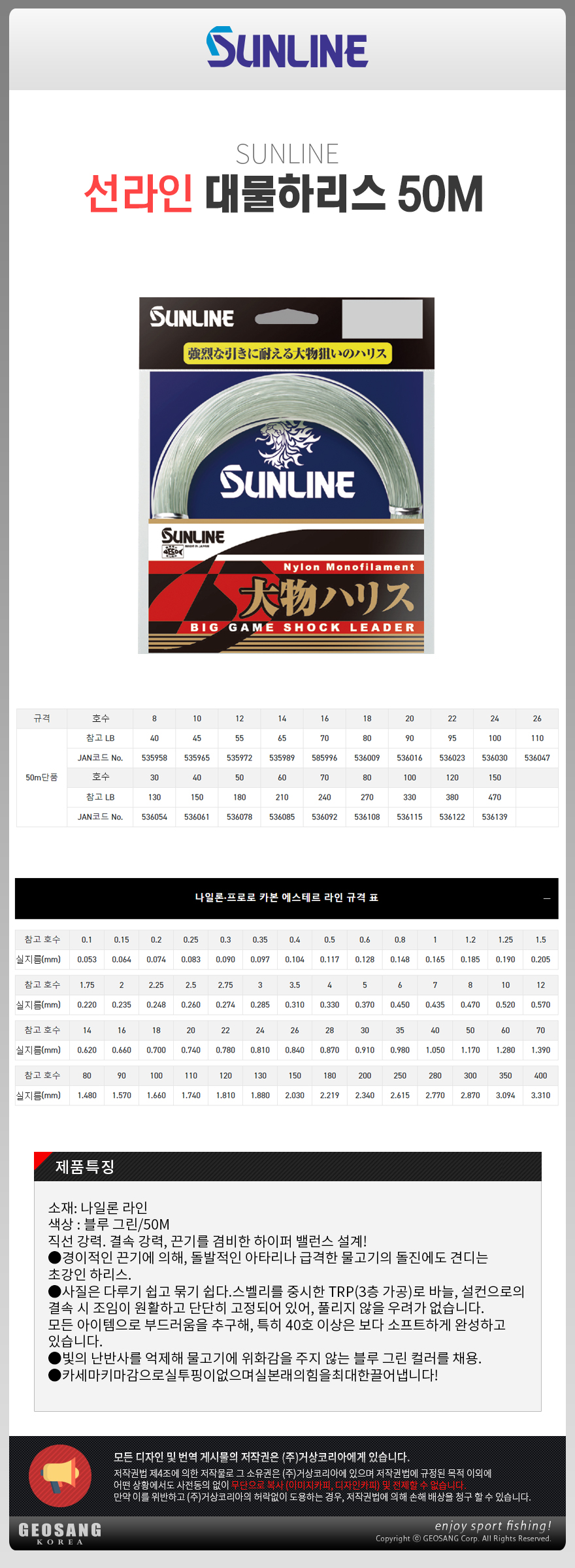 선라인 대물하리스2 50M/나일론줄 라인 바다목줄