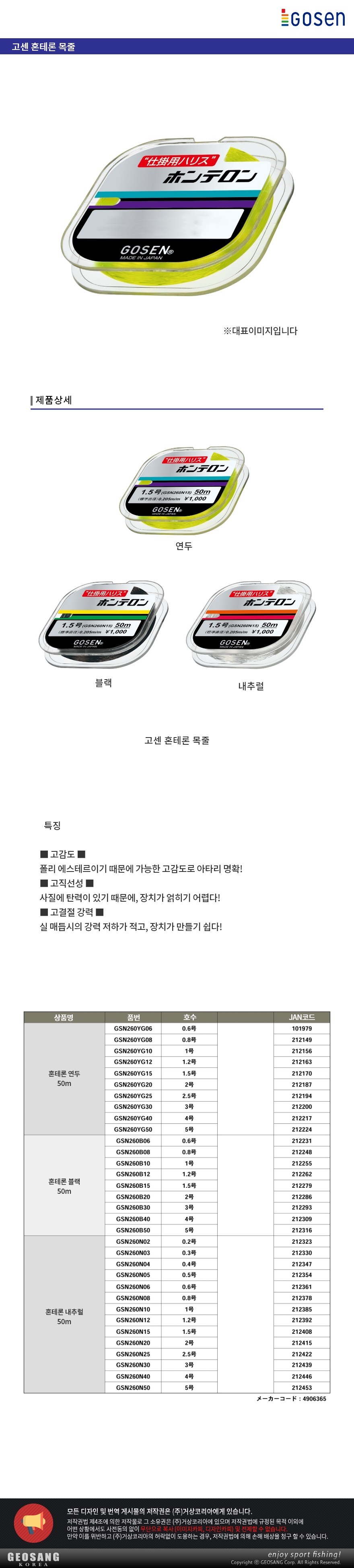 형제낚시 낚시용품의 모든것 고센 혼테론R 50M 중층낚시줄 고센낚시줄 / 폴리 에스테르